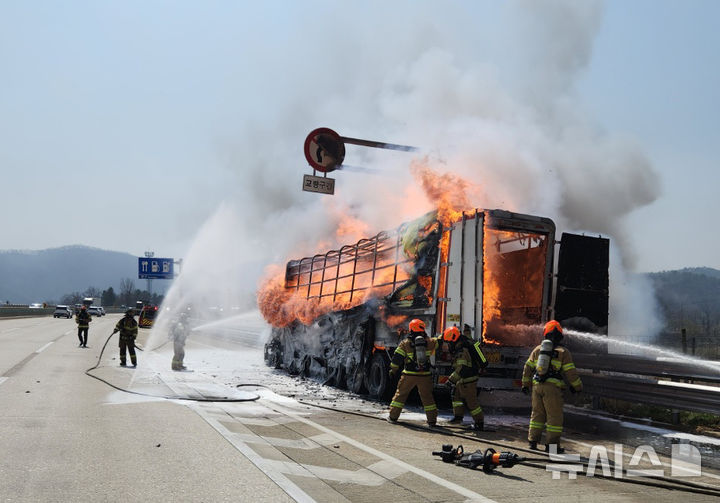 경부고속도로 15t 화물트럭 화재 진화 중
