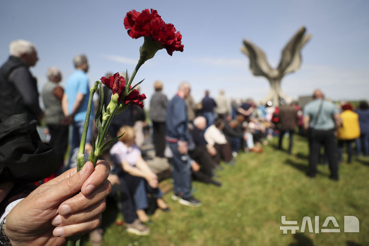 카네이션 들고 2차대전 희생자 추모하는 사람