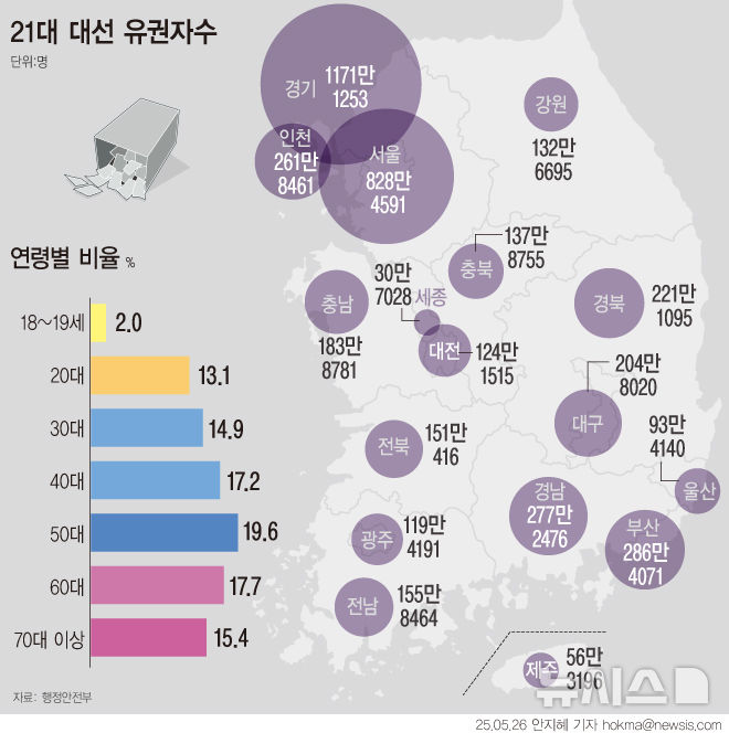 [그래픽] 대선 유권자 4439만명…50대 가장 많고 20대 가장 적어