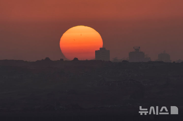 가자지구 폐허 뒤로 지는 해