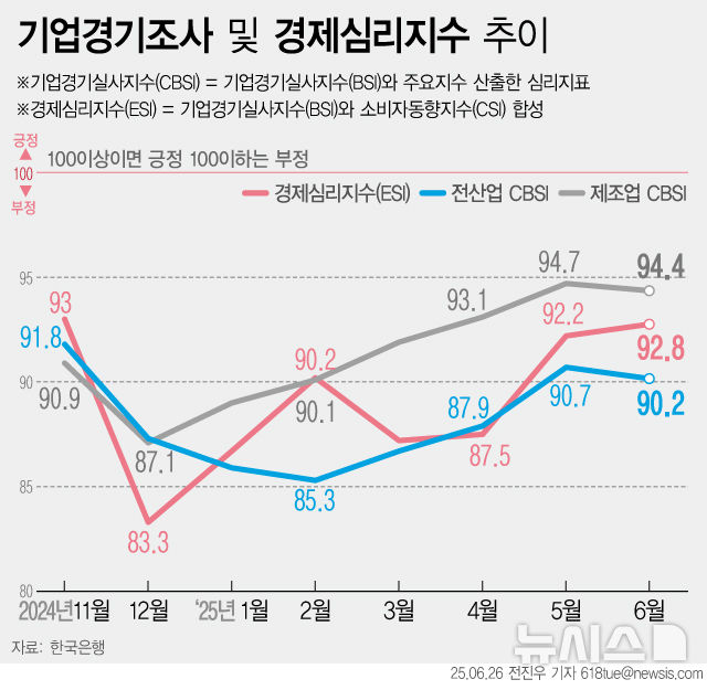 [그래픽] 6월 기업심리, 중동 리스크에 넉달 만에 '주춤'