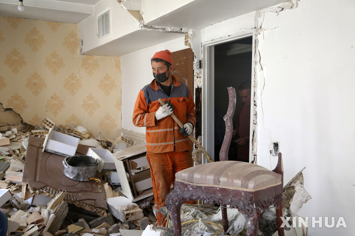 공습으로 파손된 건물 내부 치우는 이란 남성