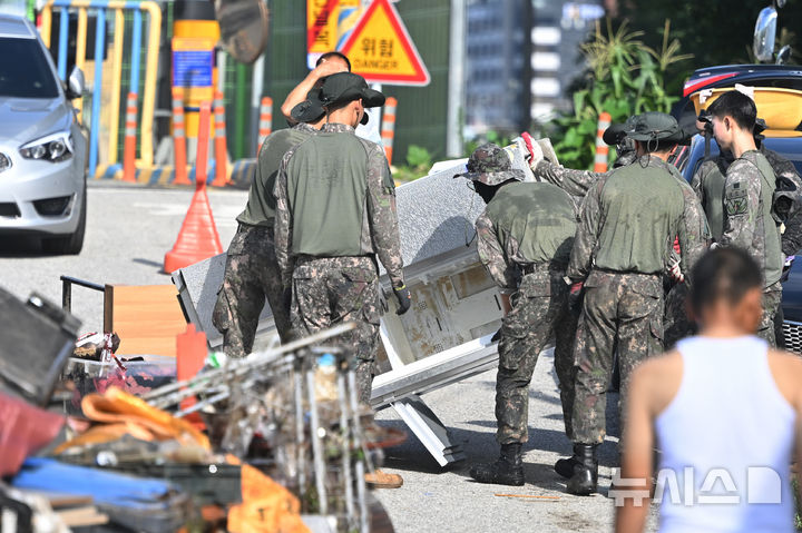 침수 주택에서 가구 꺼내는 군인들