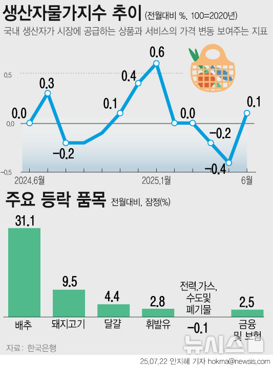 [그래픽] 생산자물가지수 다시 꿈틀…배추·돼지고기·달걀값 ‘쑥’