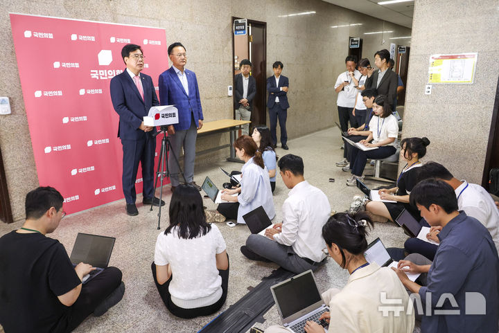 특검 국민의힘 압색 및 국민의힘 의원 45명 제명 촉구 결의안 발의 계획 관련 입장 발표하는 송언석 비대위원장