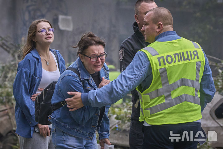 러 공습 피해 아파트 앞에서 흐느끼는 주민들