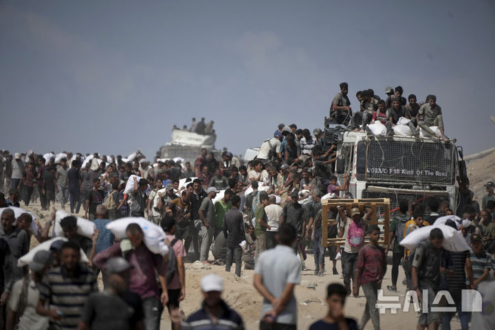 인도적 물품 트럭에 몰려든 팔레스타인 주민들