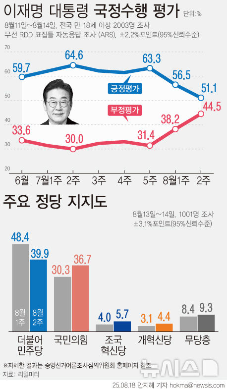 [그래픽] 이재명 대통령 지지율 51.1%…민주 39.9% 국힘 36.7%