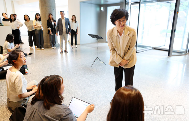 취재진 향해 인사하는 원민경 장관 후보자
