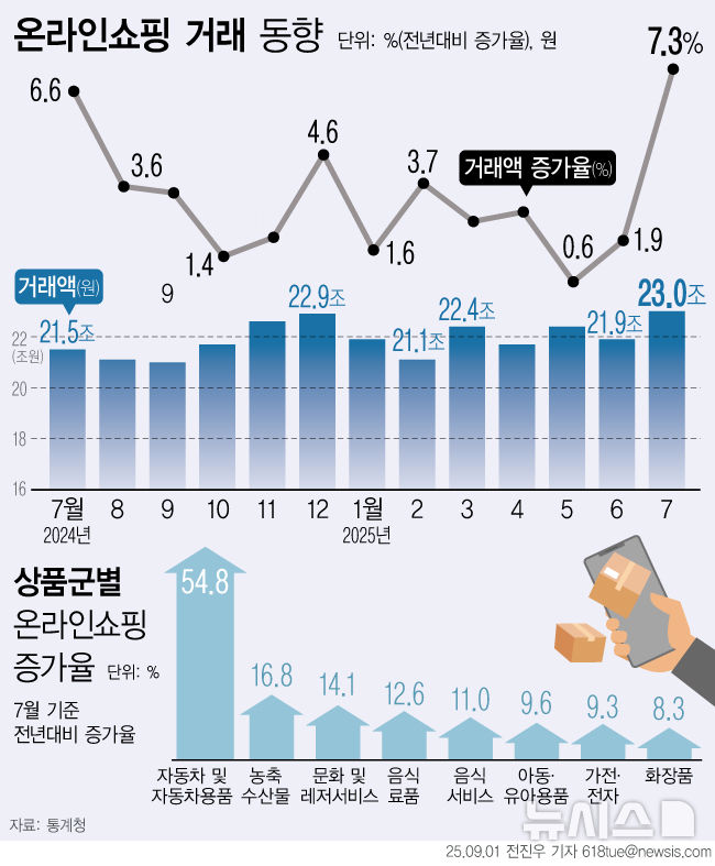 [그래픽] 7월 온라인 쇼핑 7.3%↑…'티메프 사태' 이후 최대폭 증가