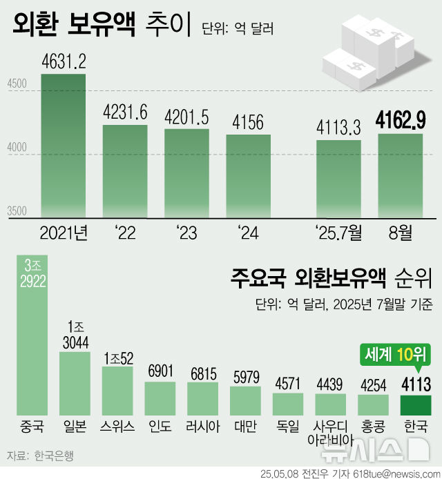 [그래픽] 외환보유액 석달째 4100억 달러 상회…세계 10위 유지