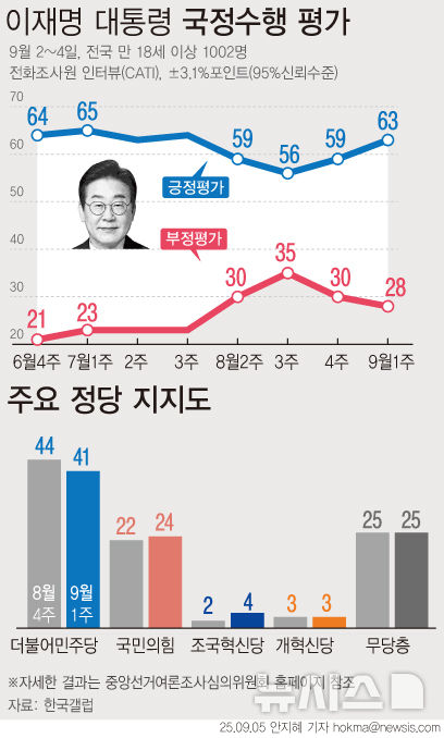 [그래픽] 이재명 대통령 지지율 63%…민주당 41%·국민의힘 24% (갤럽)