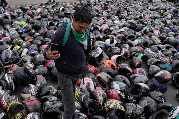 헬멧으로 보고타 도로 봉쇄한 오토바이 운전자들