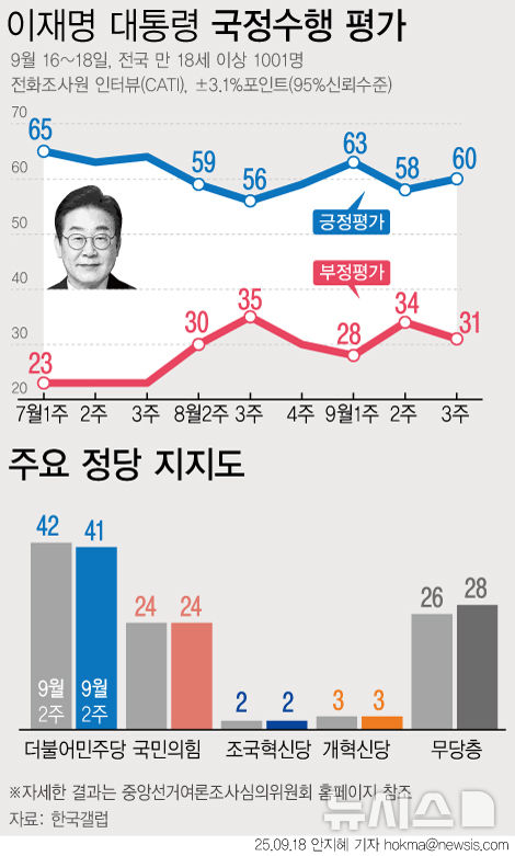 [그래픽] 이재명 대통령 지지율 60%…민주당 41% 국민의힘 24%