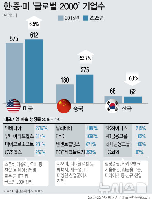 [그래픽] 한·중·미 ‘글로벌 2000’ 기업수 비교
