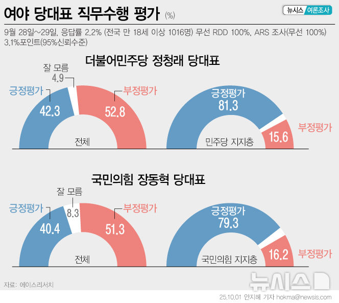 [그래픽] 당대표 직무평가, 정청래 42.3%·장동혁 40.4%[창간특집 여론조사]
