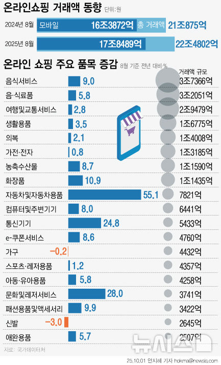 [그래픽] 8월 온라인 쇼핑 22.5조…티메프 사태 후 e쿠폰 첫 반등