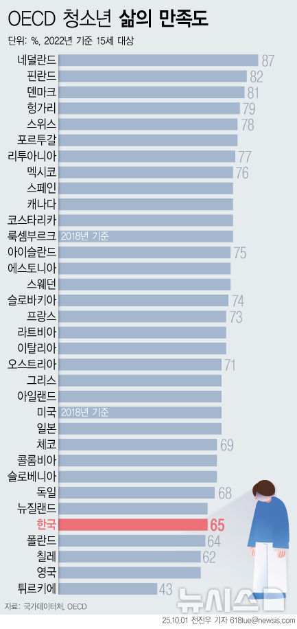 [그래픽] 청소년 삶의 만족도 OECD 하위권