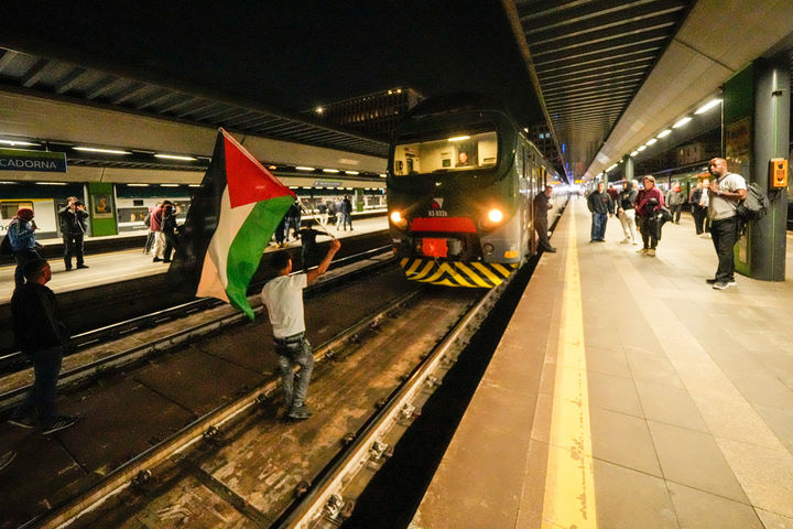 열차 선로에서 시위하는 이탈리아 친팔 시위대