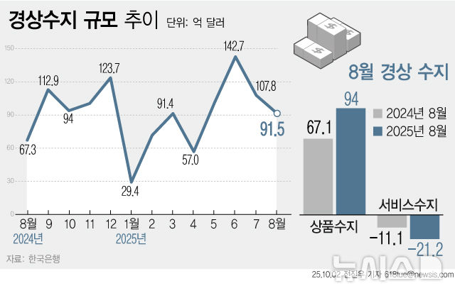 [그래픽] 8월 경상수지 91.5억 달러…28개월째 흑자