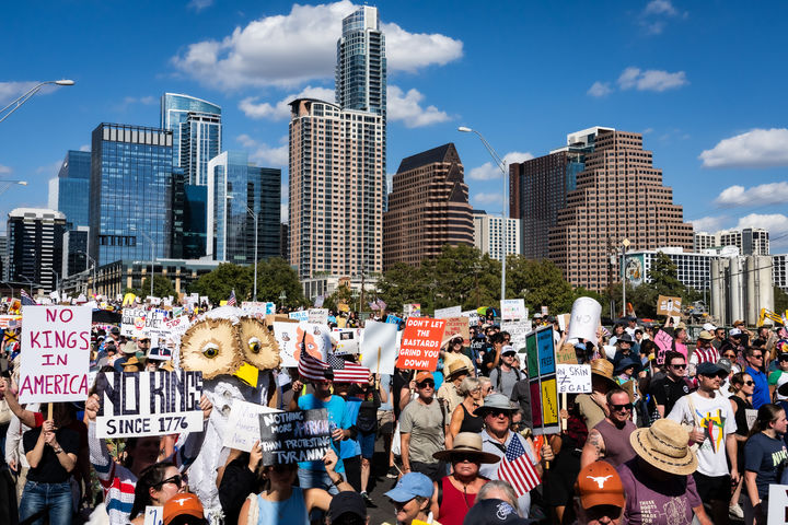 오스틴 거리 행진하는 '노 킹스' 시위대