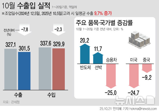 [그래픽] 10월 1~20일 대미 수출 -24.7% 급감