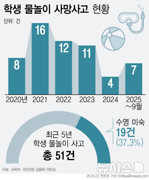 [그래픽] 5년간 학생 51명 물놀이 사망…10명 중 4명 '수영 미숙'