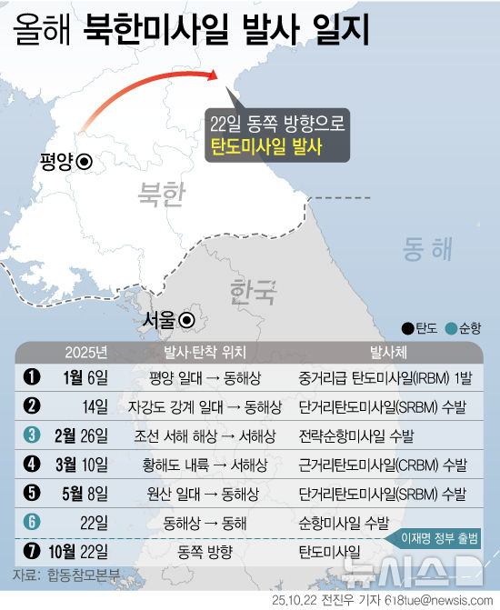 [그래픽] 북, 동쪽 방향으로 탄도미사일 발사…APEC 앞두고 도발