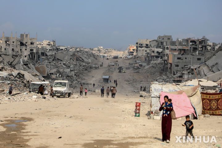 파괴 건물 즐비한 거리 지나는 팔 주민들