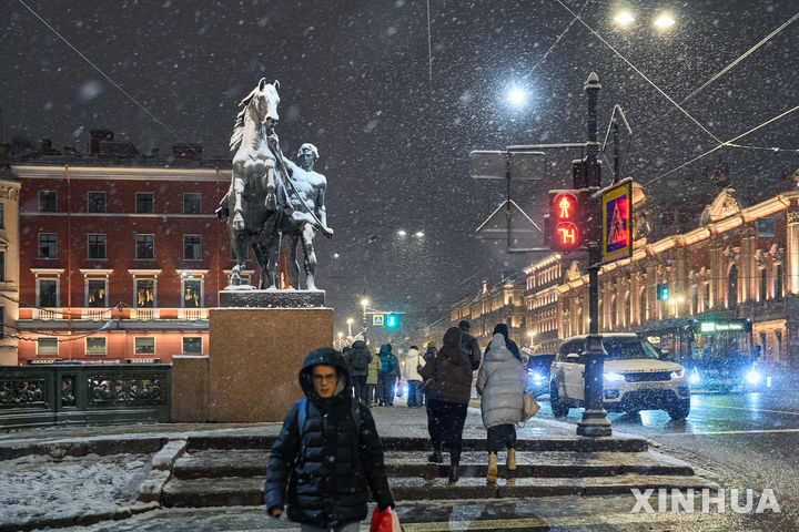 눈 내리는 상트페테르부르크 밤거리 걷는 시민들