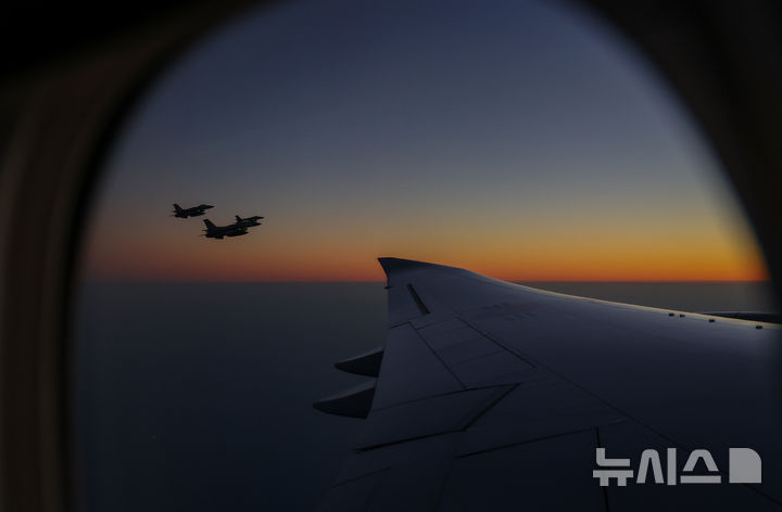 공군 1호기 호위 비행 하는 UAE 공군 전투기