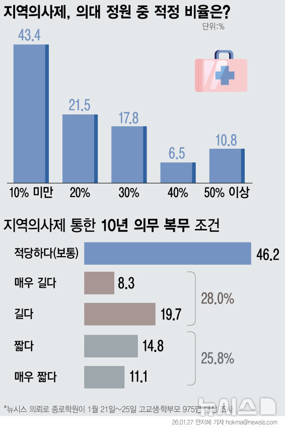 [그래픽] "지역의사제, 의대 정원 10% 미만 선발 적당" 43%