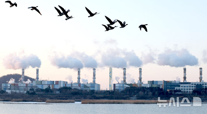 발전소 위 날아가는 기러기