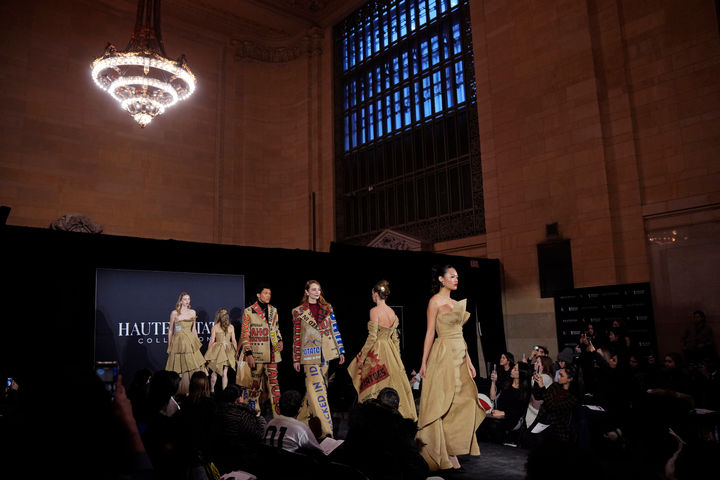감자 자루 의상 입고 런웨이 걷는 모델들