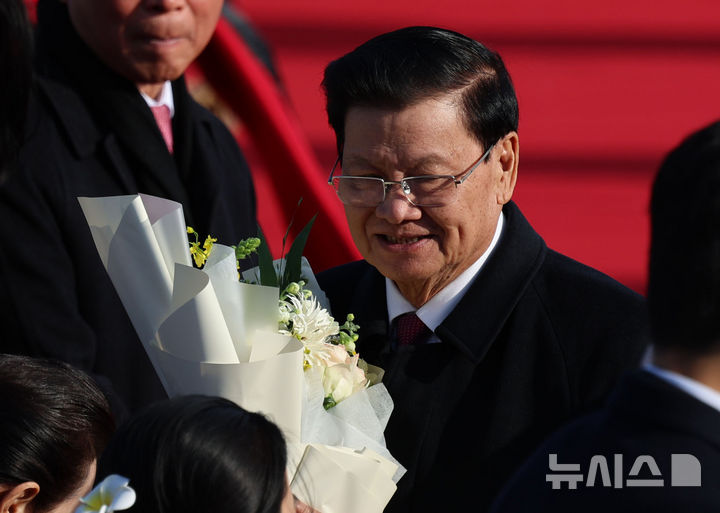 꽃다발 받은 통룬 시술릿 라오스 국가주석