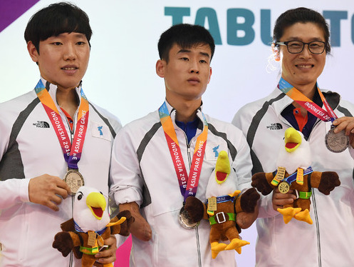 장애인 체육 사상 첫 남북 단일팀, 나란히 '메달 합창'