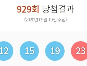 929회 로또 1등 '7, 9, 12, 15, 19, 23'…보너스 '4'
