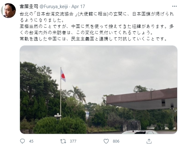 "일본, 대만 대표사무소에 일장기 게양"…미일 공동성명 직후