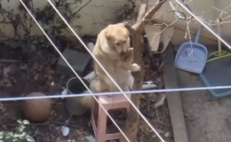 나무에 메달린 채 의자에 두 발로 선 대형견…'학대 논란'