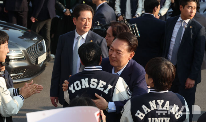 "청년들만 남아달라"…尹 '과잠 대학생 포옹' 연출 논란