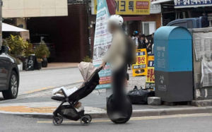 "애가 에어백이냐"…전동휠 타며 유아차 미는 남성 논란