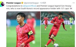 EPL, 손흥민 A매치 최다 출전 주목…"토트넘 레전드 축하해"