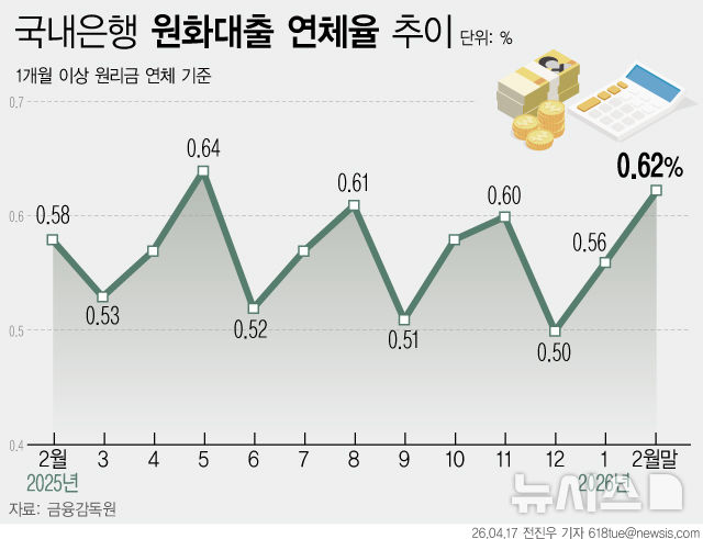2월 은행 대출 연체율 0.62%…전월대비 0.06%p↑