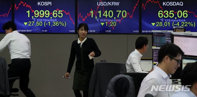 29일 코스피지수는 장중 한때 2000선 아래로 떨어져 1999.65를 기록했다. [email protected]