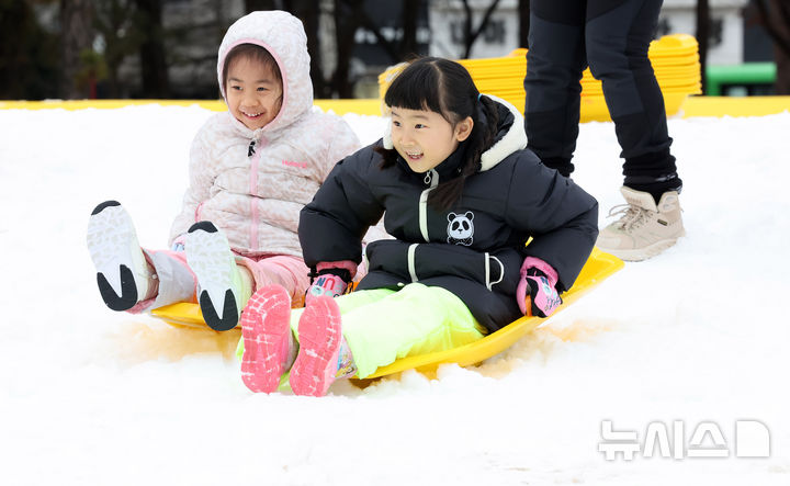 포근한 겨울에 눈썰매 대신 잔디썰매