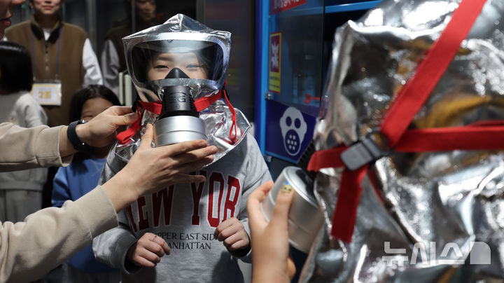 지하철 화재시 마스크 착용 체험하는 어린이들