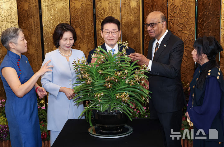 싱가포르 국화 난초 설명 듣는 이재명 대통령