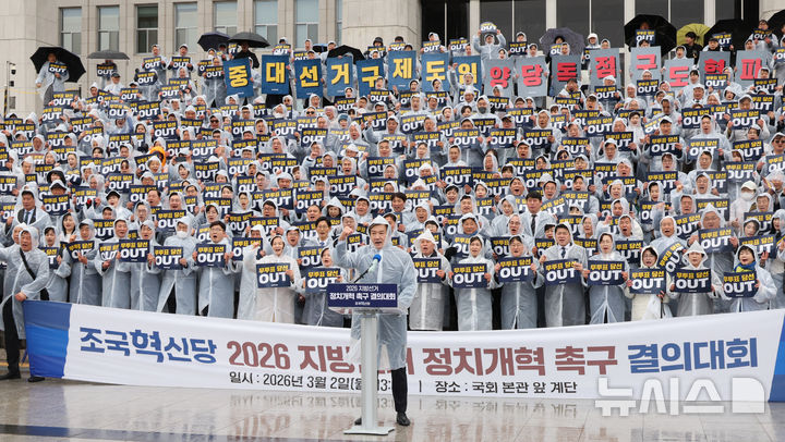 2026 지방선거 정치개혁 촉구 결의대회 구호 외치는 조국혁신당