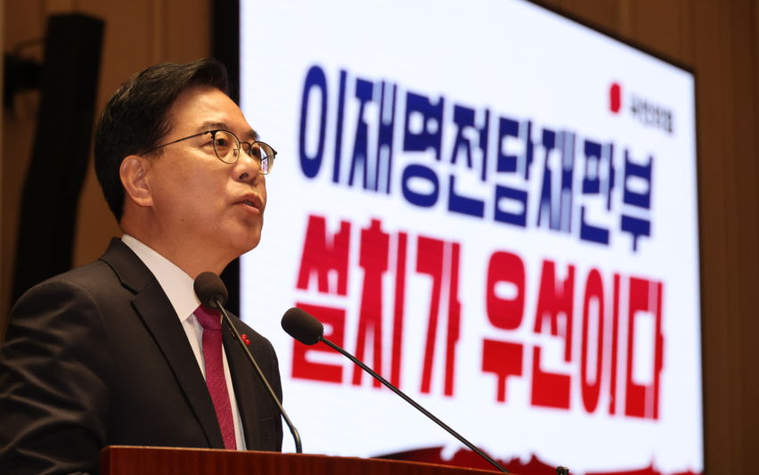 '통일교 특검법 발의' 회동 마치고 기자회견하는 송언석-천하람
