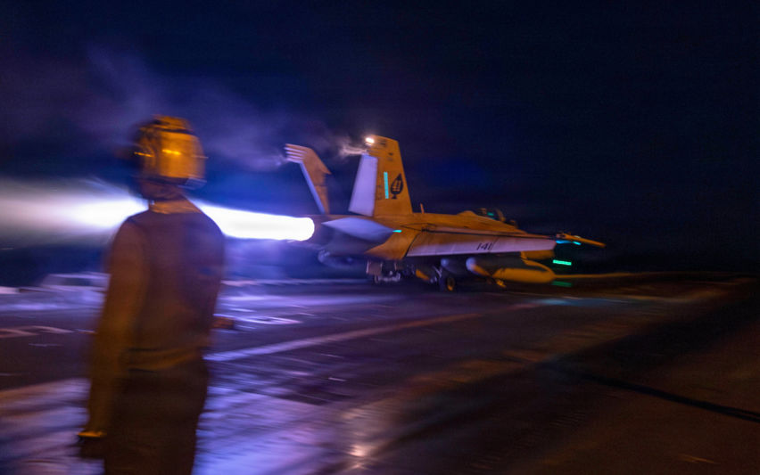 에이브러햄 링컨 항모에서 출격하는 F/A-18E 전투기